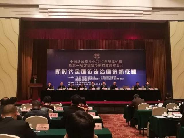 2017年12月9日,以“新时代全面依法治国的新征程”为主题的中国法治现代化2017年智库论坛暨第一届方德法治研究奖颁奖典礼在南京隆重举行。来自中国社会科学院、中国人民大学、北京大学、中共中央党校、清华大学、中国政法大学、复旦大学、上海交通大学、华东政法大学、浙江大学、武汉大学、西北政法大学、吉林大学、ylzzcom永利线路检测中心、南京师范大学、东南大学、上海市社会科学联合会、江苏省社会科学院等高等院校和科研机构,以及中国法学会、最高人民法院司改办、最高人民检察院检察理论研究等实务部门的120余位专家学者出席论坛并参与研讨。来自《人民日报》《光明日报》《新华日报》,新华网等新闻媒体,以及法律出版社、《中国社会科学》杂志社、《新华文摘》杂志社、《中国高校社会科学》编辑部等学术刊物的编审专家也应邀出席论坛。
