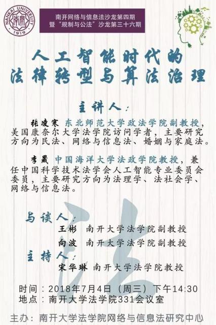 南开网络与信息法沙龙第四期 :人工智能时代的法律转型与算法治理(主讲人张凌寒、李晟,2018年7月4日)