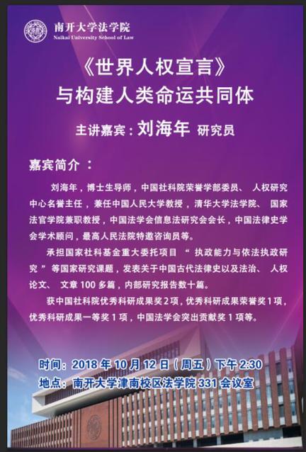 讲座预告:《世界人权宣言》与构建人类命运共同体(2018年10月12日下午2:30)