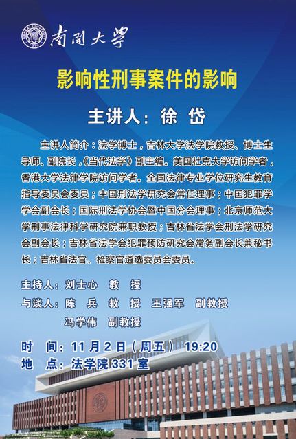 【讲座预告】徐岱教授 | 影响性刑事案件的影响【11.2晚】
