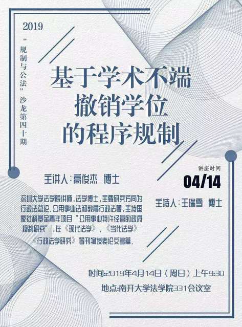“规制与公法”沙龙第四十期:基于学术不端撤销学位的程序规制(2019年4月14日9:30ylzzcom永利总站线路检测331会议室)