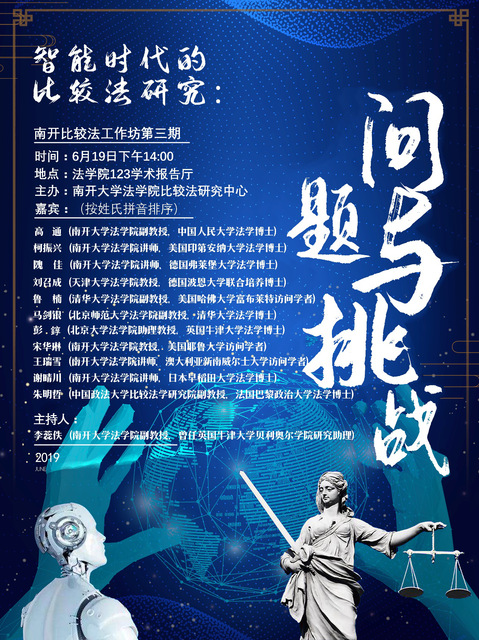 工作坊简介:人工智能技术的迅猛发展,为比较法研究带来了一系列的问题与挑战,需要比较法学界直视挑战,做出回应。于此,本次南开比较法工作坊力邀数位研究不同国别(涉及英、美、法、德、日等国)、不同学科(涉及法理、宪法、行政法、刑法、民法等部门法)的比较法学者,拟围绕比较法研究中的理论新解和新兴实践问题进行深入研讨,以期对智能时代的比较法研究和发展中的现实问题的解决有所裨益。