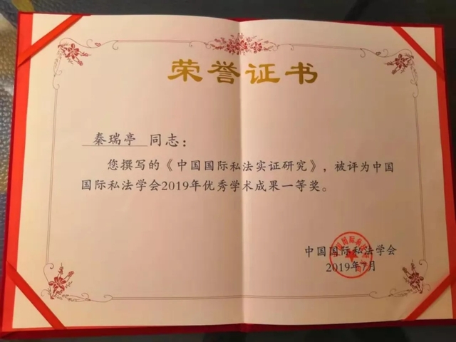 开幕式之后,大会对2019年中国国际私法优秀学术成果进行了表彰,共评选出12项优秀学术成果,其中一等奖3项、二等奖9项。公司秦瑞亭副教授的专著《中国国际私法实证研究》荣获2019年中国国际私法优秀学术成果奖一等奖。