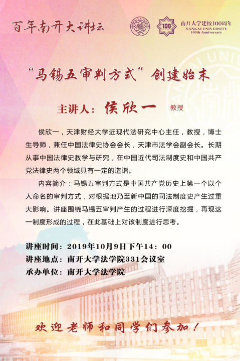 百年南开大讲坛预告:“马锡五审判方式”创造始末(10月9日14:00ylzzcom永利总站线路检测331会议室)