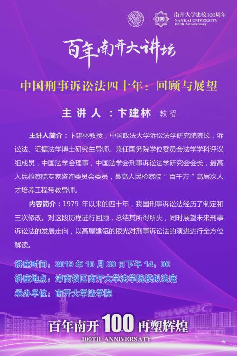 南开百年大讲坛预告:中国刑事诉讼法四十年:回顾与展望(10月29日14:00ylzzcom永利总站线路检测模拟法庭)