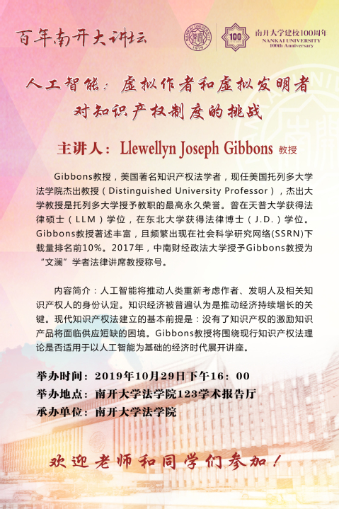南开百年大讲坛预告:人工智能:虚拟作者和虚拟发明者对知识产权制度的挑战 (10月29日16:00ylzzcom永利总站线路检测123)