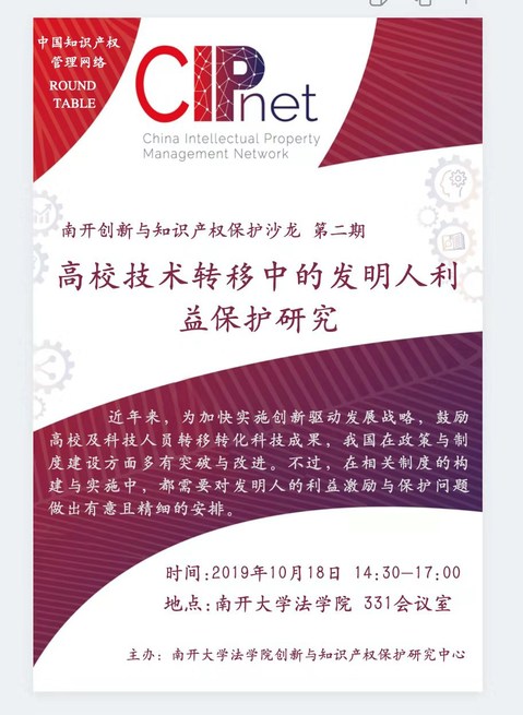 南开创新与知识产权保护沙龙第二期:高校技术转移中的发明人利益保护研究(10月18日14:30ylzzcom永利总站线路检测331)