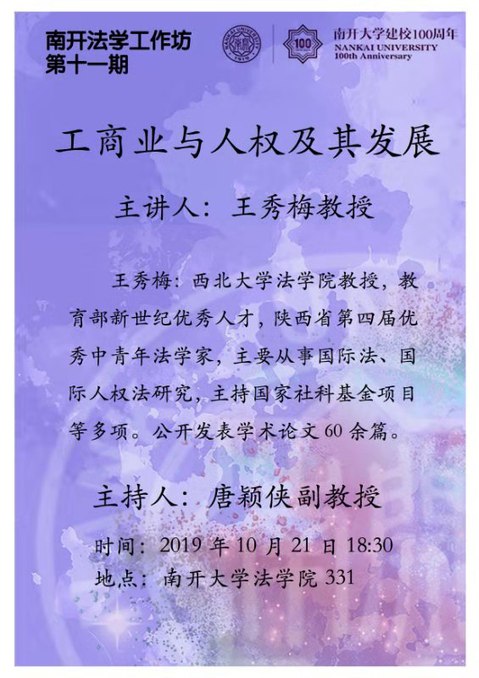 南开法学工作坊第十一期预告:工商业与人权及其发展(10月21日18:30ylzzcom永利总站线路检测331)