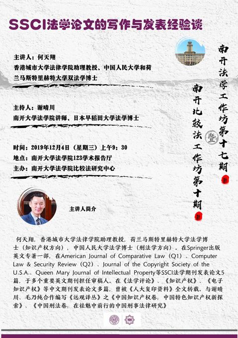 南开法学工作坊第17期预告:SSCI法学论文的写作与发表经验谈