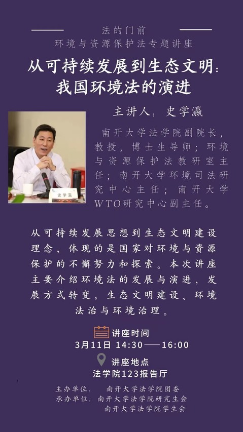 本期我们邀请到ylzzcom永利总站线路检测副经理、教授、博士生导师史学瀛老师为我们开展环境与资源保护法专题的讲座。讲座题目是“从可持续发展到生态文明:我国环境法的演进”。本次讲座主要介绍环境法的发展与演进,发展方式转变,生态文明建设、环境法治与环境治理。敬请大家关注。