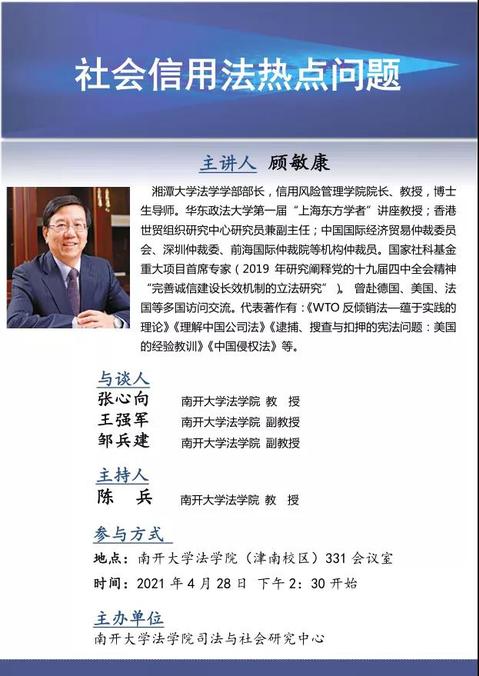 讲座预告:社会信用法热点问题(顾敏康,4月28日14:30ylzzcom永利总站线路检测331)