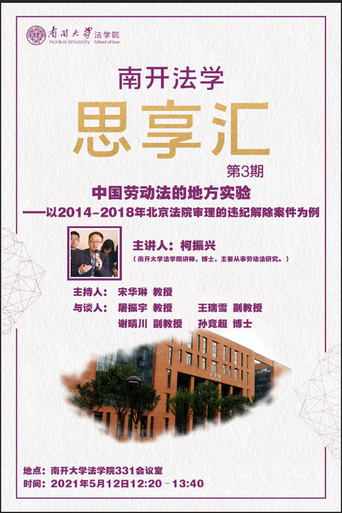 南开法学思享会第三期预告:中国劳动法的地方实验——以2014-2018年北京法院审理的违纪解除案件为例