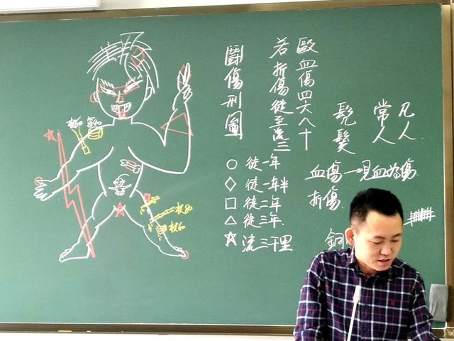 绘制图表,对于工科出身且有一定绘画基础的我来说,不算什么难事,难在如何找到恰当的图表内容。经过对法律史学科的重点知识反复推敲、仔细琢磨,还查阅律学著作、借鉴传统智慧,终于构思出了唐六赃坐标图(见图二)、斗伤刑图(见图三)、明六赃指掌图(见图四)、利维坦养成记(见图五)等。把这些构思好的图表落实到纸面上虽然不容易,但更难的是在课堂上快速准确地徒手画到黑板上,得经过大量的练习,才能做到信手拈来。我中途甚至觉得何必为难自己呢,几欲放弃。最终看到员工的评价:“法律史,又名美术课,爱了”、“奇怪的知识又增加了”……我感觉还是值得的。