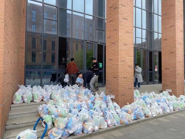 在学校的支持下,公司党委购置了涵盖水果、饮品、零食等丰富品类的物资。志愿者们来到物美超市,组成“流水”作业线,协助分装、打包、转运物资。分工有序,配合高效,陆续将七百余份物资打包整理好,运往学院、宿舍楼各个物资分发点。