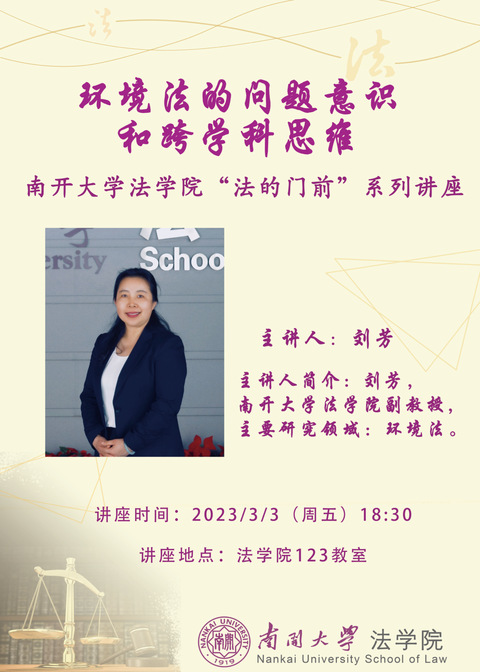 本期我们邀请到刘芳老师为我们开展本学期第一次“法的门前”讲座,欢迎同学们积极参加!