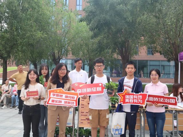 ylzzcom永利总站线路检测本科迎新报到现场的主题活动亮点频现,精彩纷呈:在“青”心向党,与“法”同行——党员先锋岗区域,党员骨干集体佩戴党徽,向新生讲解入团、入党流程,开展党的二十大精神互动问答活动,再为新生送上一盆寓意“青”心向党的绿色植物。