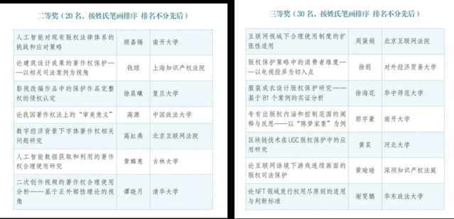 《中国版权》杂志是由中央宣传部领导,国家版权局主管,中国版权保护中心主办的中央级版权专业期刊。征文活动旨在全景展现新时期我国版权保护体系建设的创新成果和发展成就,为版权工作高质量发展提供理论支撑和智力支持,帮助青年人才成长为推进版权强国建设的重要力量。本届征文对象为年龄在45周岁以下的青年版权工作者及高校在校教师和老员工,包括但不限于司法一线青年工作者、青年律师、企业青年工作者、知识产权研究机构青年学者,各类版权服务机构青年骨干,高校青年教师(含博士后)及本科生、硕士生、博士生等。最终评选出:一等奖10名,二等奖20名,三等奖30名。获奖者将择优入围版权强国青年智库,获奖作品将择优在《中国版权》杂志刊发。